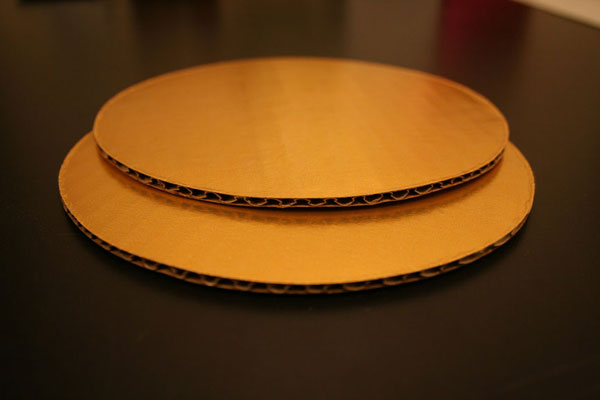 These eight inch cake rounds are now available. You asked for an attractive and affordable cake board and here it is! Take a look at the photo above and note the razor cut edges of the cake round. These grease resistant gold foil laminated cake boards are die cut. This manufacturing method leaves the crisp edge of the corrugated cardboard exposed. You can actually see the cardboard flutes giving these little medallions their strength. If you are looking for something simple, affordable, strong, and still classy - our eight inch cake rounds may be just the platform to present your sweets.