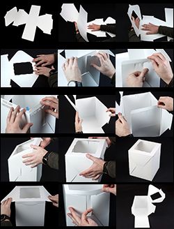 After you have pre-folded the crease lines, fold up one of the side panels to 90°. Bring up the back panel and prepare to engage the bottom of the tabbed panel into the long slot of the side panel. Thats a lot of words so here is a photo.