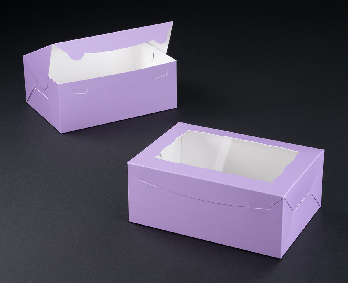We build these lavender boxes for bakers who want something different. This light purple packaging is designed, manufactured, and shipped from our small factory in Iowa. Shipping is fast and free (same-day shipping if you order before noon, Central Time).